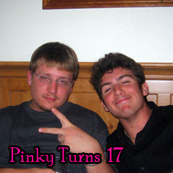 Pinky. My bueno amigo jus had his diece-siete over at the very luxorious comfor inn! And hey! At 81 dollars a night it better be right? Hella heads attended, our friend Jose C. showed up with his amigos Coron & Pacific. Twas a badass hotel room let me tell ya…hot red lights in the bathroom plus large amounts of marijuana equals girls too fucked up to get themselves out of the tub. I think I look a lot like a vampirein that pic and Pinky looks a tad crazy. As for this one it kinda appears as if my girl is a little nervous that the person holding her up might hit the deck any minute. in this pic I am reminded of big bird from sesame street, jus because. So anyway, it was a crackin night, I imitated Pinky, I noted the striking physical, and social similarities between these twins and oh yes they are fucking twins even though they “supposedly” say that they were born eleven months apart, thats horseshit. Joe-sef looked all washed up and ever so trashed. The same could be said for Caitlin who was showin off her own greenish complexion after her deep conversation with Jose C. As for me, I spent a lot of time on the bed with that hot girlfriend of mine. Hellova bed too, the bloodstained matress, the crispy sheets, and the bullet holes in the bed frame. Hell of a time, jus wait till your 18th Pinkster.
